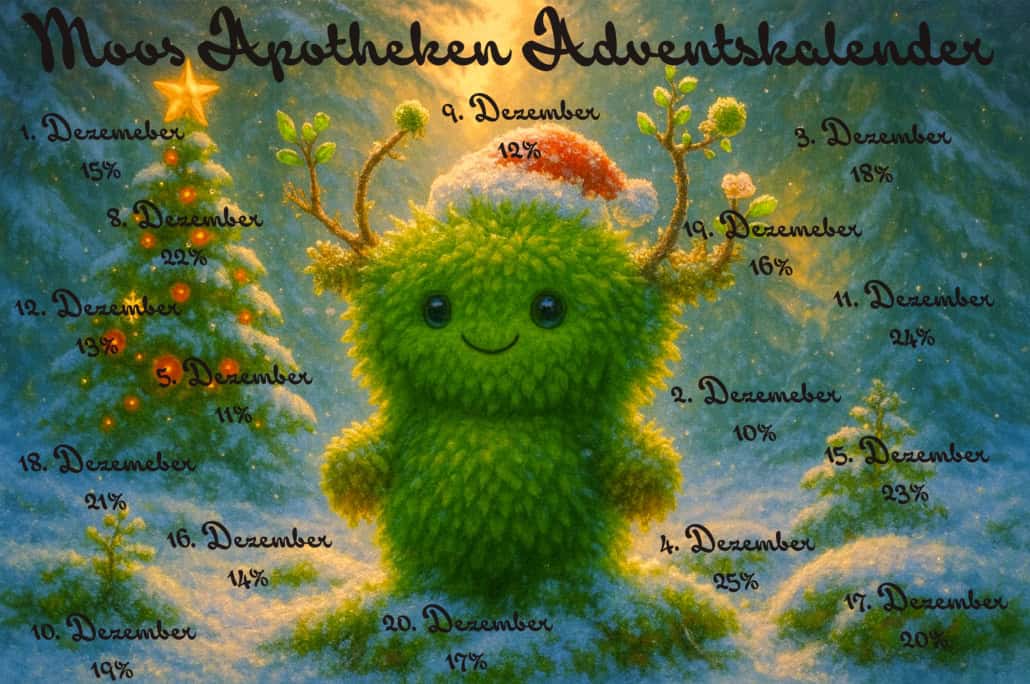 Die Adventszeit hat bei uns schon immer einen besonderen Zauber – und in diesem Jahr könnt ihr euch wieder auf unseren Moos Apotheken Adventskalender freuen. Während der gesamten Vorweihnachtszeit erwarten euch jeden Tag neue exklusive Rabatte, die ihr flexibel auf ein Produkt eurer Wahl anwenden könnt.
